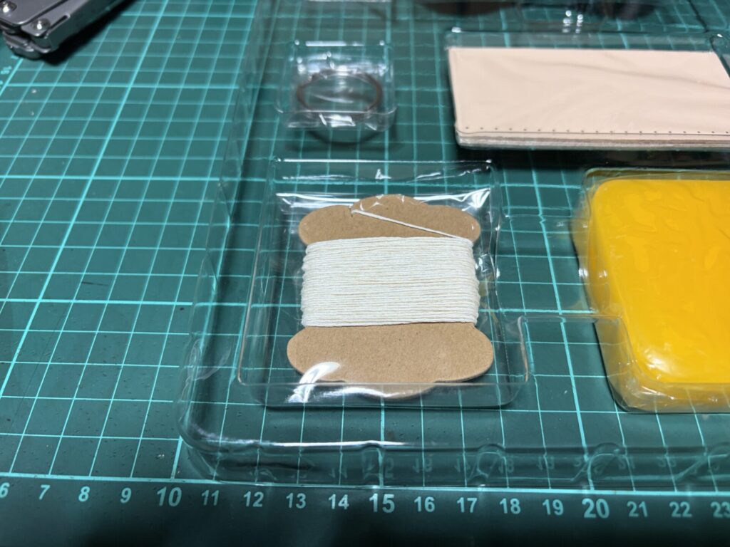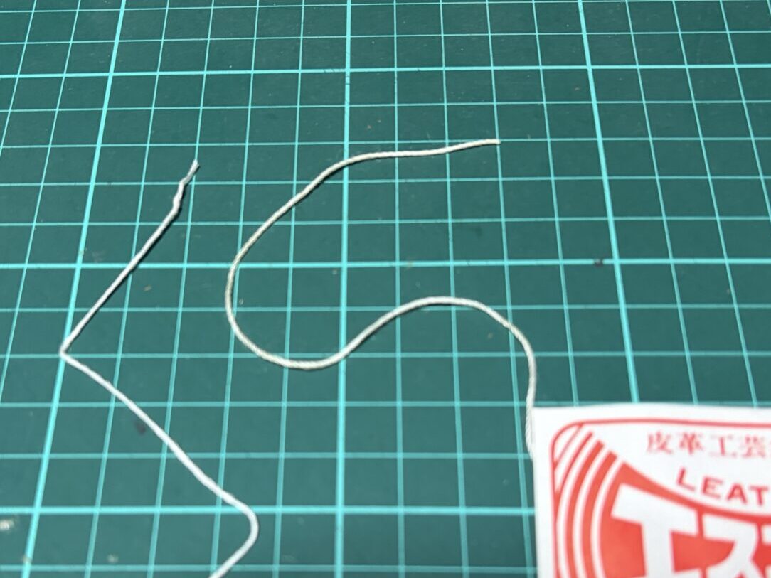 ちょっと分かりづらいですが右のエスコード(一般的なレザークラフト用麻糸)と比較すると太さが均一ではありません。またエスコードはロープのようにしっかり撚ってあるのに対して付属の糸はただ糸状にまとめたような見た目をしています。できれば実際の作品用ではもう少しクオリティの高い糸を付属して欲しいですね。