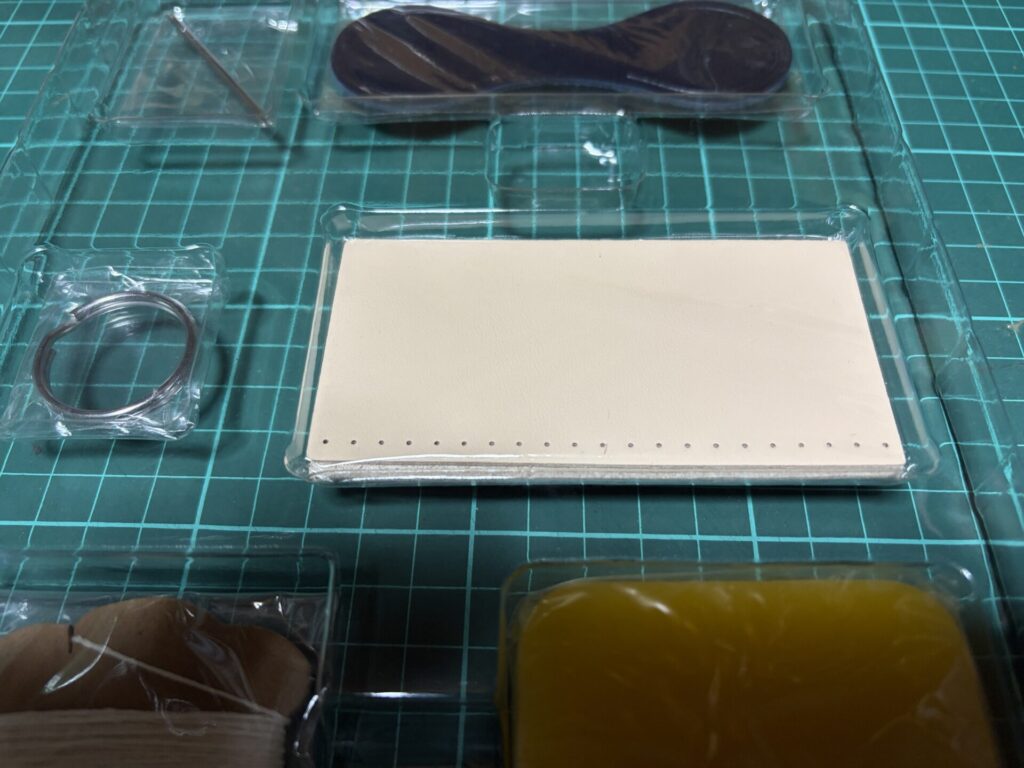 今回は穴を開ける道具が付属しないため初めから縫い穴の開けたヌメ革が2枚付属します。何かの作品になるわけではないため革室について厳しく見るつもりはありませんがまあ、普通のヌメ革ですね。
